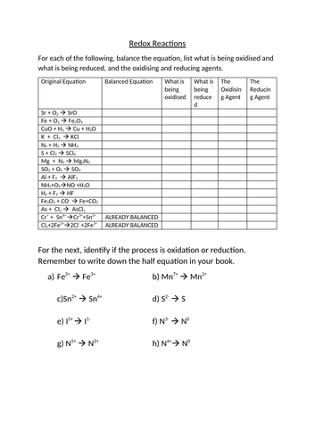 Redox Reaction Worksheet Teaching Resources