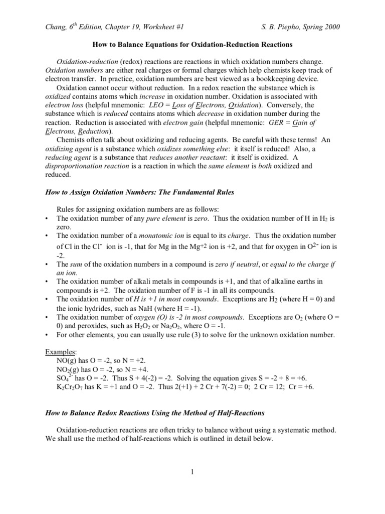 Redox Worksheet Practice 1 1 2 3 4 5 6 Rules For Balancing Redox